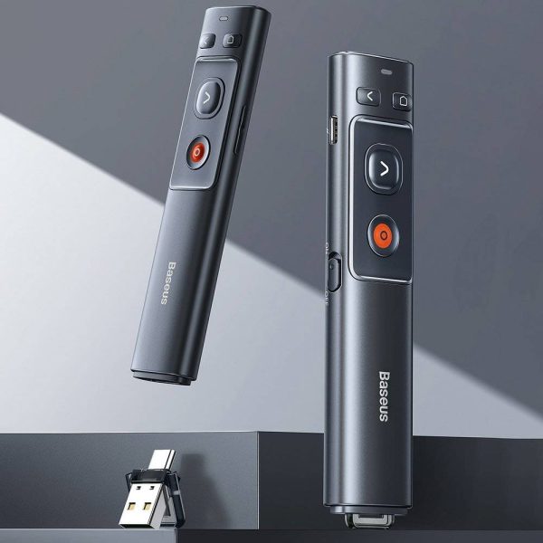 The Baseus Orange Dot Wireless Presenter is a small, wireless device that can be used to control presentations on a computer or projector. It has a laser pointer that can be used to highlight specific areas of the presentation, and it also has a button that can be used to advance slides.